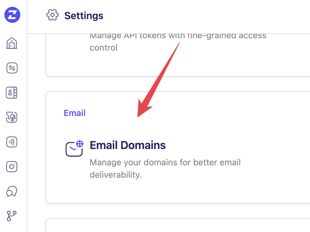 - Navigate to the Settings icon from the left Nav Bar, and click on Email Domains under Email