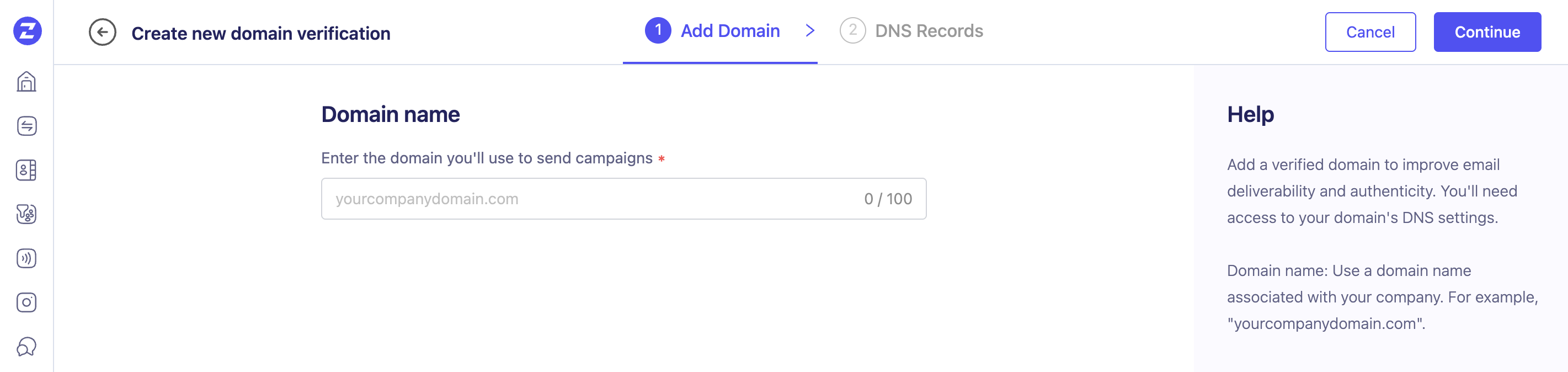 Begin by logging into your ZEPIC dashboard and navigating to the "Settings -> Email Domains" section. Click on " Add Domain" to kickstart the domain verification process. This is your go-to place in ZEPIC for all domain-related settings and verifications.